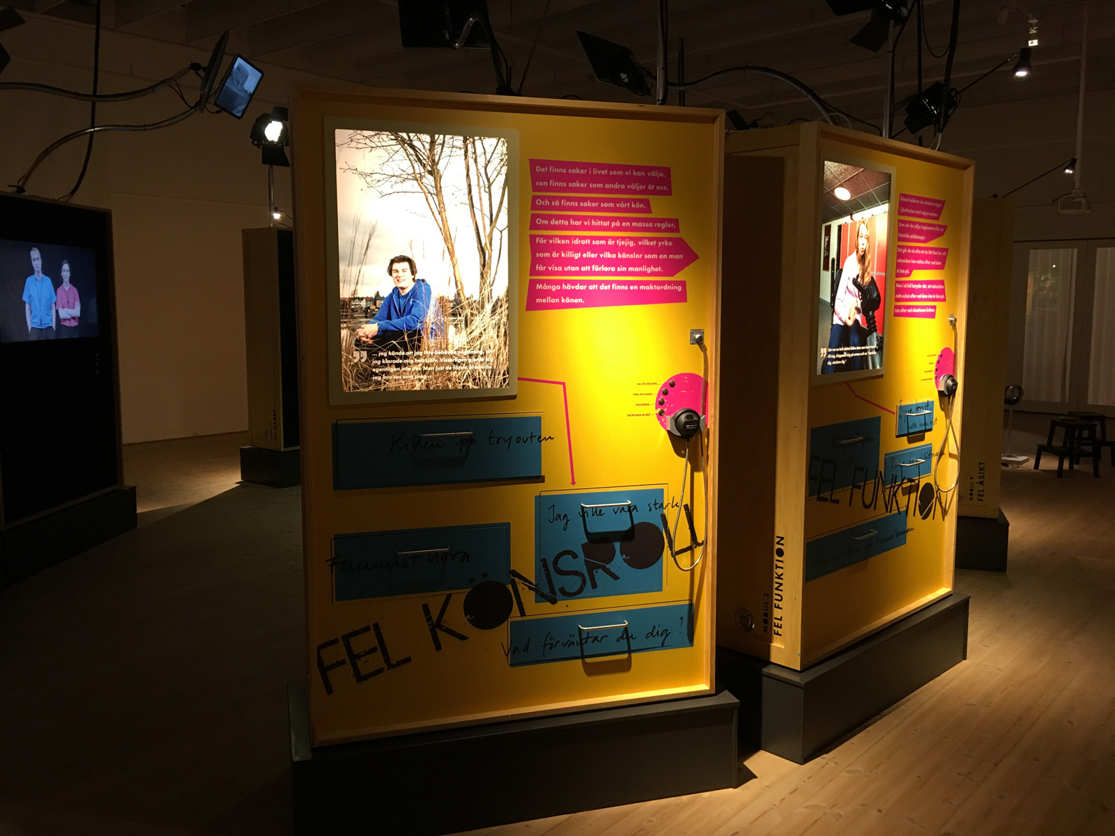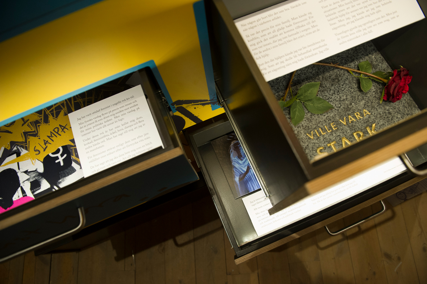 The content was based on young people’s stories, thematically divided into nine modules where visitors could experience them in pull-out boxes and dramatized readings by actors.